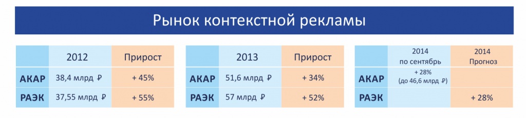 Контекстная реклама за 2013 год набрала в объеме 57 млрд руб. и продемонстрировала 52% рост по сравнению с показателями 2012 года, тогда как эксперты прогнозировали лишь 28% рост. Правда, в том же 2012 году продажи контекста продемонстрировали лучшую динамику по сравнению с 2013 годом — рынок вырос на 55%, составив 37,55 млрд руб. В 2014 году эксперты ожидают увеличение объемов продаж контекста на 28%. Правда, в этот раз их прогноз имеет значительно больше шансов сбыться.