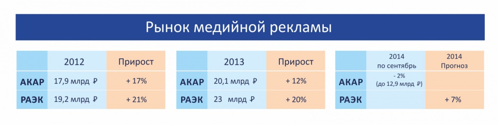 Объем рынка медийной рекламы в 2013 году РАЭК оценил в 23 млрд руб., что на 20% больше, чем в 2012 году. Такой рост превзошел ожидания экспертов, которые прогнозировали увеличение объемов рынка на 16% в прошлом году. Ожидаемый рост в 2014 году составит +7%.