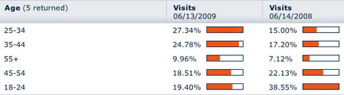 Аудитория популярной сильно повзрослела. По данным исследования Hitwise, за прошедший год доля пользователей в возрасте 25-44 года выросла с 32% до более, чем половины. Данная тенденция наблюдалась и в марте этого года, тогда по данным источника из Facebook, количество пользователей старше 35 лет увеличилось вдвое за первые два месяца этого года.