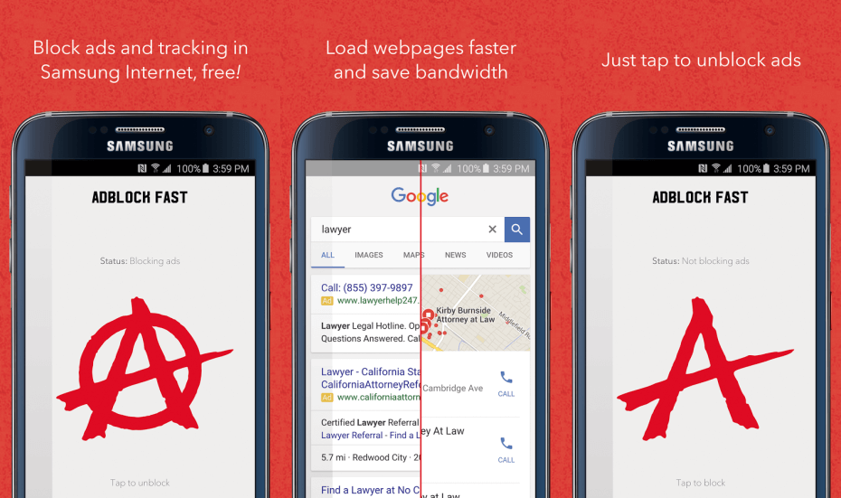 AdBlock Fast появился в Google Play 29 января, а 2 февраля его удалили. Это первый плагин, доступный для браузеров Samsung.