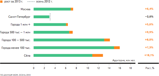 Темпы роста аудитории интернета замедляются. С осени 2012 по осень 2013 года прирост численности пользователей составил менее 9% — это самый низкий показатель за последние десять лет. Однако прирост составляет более 5 миллионов человек, что примерно равно населению Санкт-Петербурга.