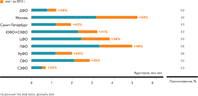 Около 25,5 миллиона жителей российских городов с населением более 100 тысяч человек воспользовались различными мобильными устройствами в декабре 2013 года для того, чтобы выйти в Сеть.