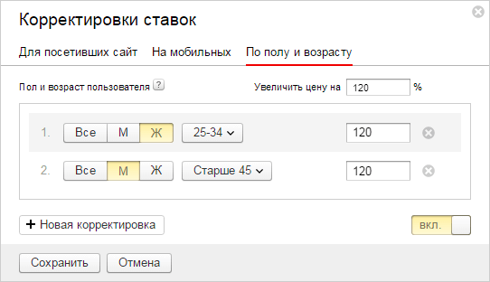 9 сентября Яндекс.Директ добавил дополнительные настройки для более гибкого управления показами и рекламным трафиком. Благодаря им рекламодатели смогут автоматически повышать ставки при показе объявлений пользователям из определенной половозрастной группы, а также тем, кто уже посещал сайт.