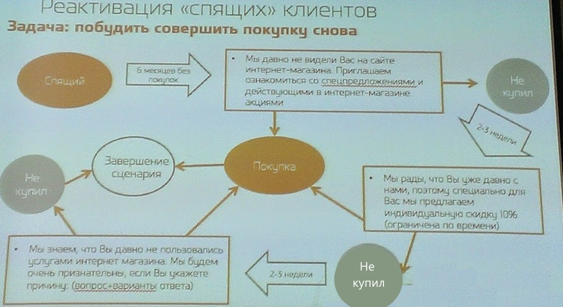 Например, для реактивации «спящего» покупателя необходимо пройти следующие этапы: