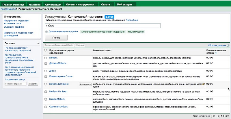С помощью нового инструмента контекстного таргетинга можно создавать списки ключевых слов узкой тематики для рекламной кампании в Google. Сделать это довольно просто: нужно ввести название категории товаров в окне поиска – и система автоматически создаст узкотематические списки ключевых слов. Далее инструмент самостоятельно распределяет их по тематическим группам объявлений. Все эти группы объявлений не зависят друг от друга.