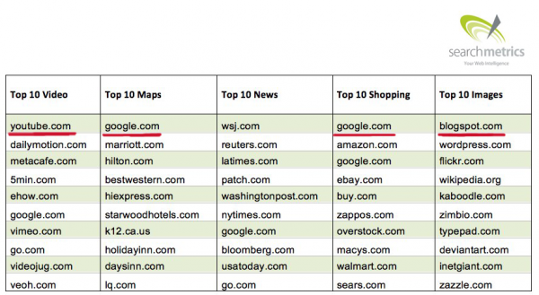 Если же посмотреть, какие сайты наиболее часто появляются в результатах Google, то можно заметить доминирование Google в разделах видео, карты, покупки и изображения.