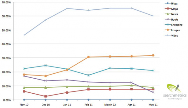 Хотите, чтобы о вас узнали в Интернете? Снимите о себе видеоролик! Согласно последнему самый часто появляющийся контент в выдаче «универсального поиска» Google (Universal Search) – это как раз видео. В приведенной таблице можно увидеть, что при демонстрации поисковых результатов в 60% Google покажет раздел «видеоролики». С большим отставанием за ним следуют картинки(30%), покупки (20%), новости, карты, книги (чуть менее 10%)и блоги.