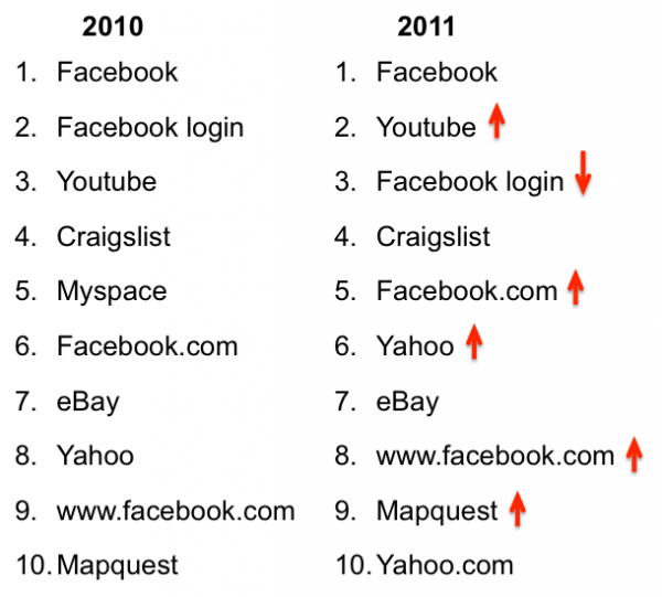 Компания Experian Hitwise объявила топ , которые искали пользователи США в 2011г. Уже третий год подряд этот список возглавляет Facebook. Объем запросов страниц этой соцсети вырос за год на 33%.