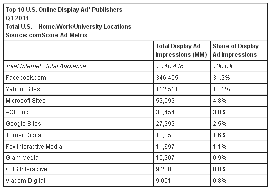 Главной «рекламной площадкой» оказалась социальная сеть Facebook, показавшая 346,455 миллиардов рекламных объявлений (31,2 %) , что на 15% выше результатов 1-го квартала 2010. Второе место занял Yahoo!, показавший 112 миллиардов объявлений (10,1%), за ним следует Microsoft с 54 миллиардами объявлений (4,8%). Google занял всего лишь 5 место, продемонстрировав 27,993 миллиардов объявлений (2,5 %).