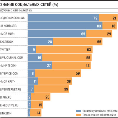 Была опрошена одна тысяча пользователей в возрасте 16–49 лет. В итоге выяснилось следующее: все опрошенные знают, что такое «Одноклассники», а 79% респондентов зарегистрированы в этой сети. Со «Вконтакте» знакомы на 1% меньше опрошенных (99%), зато зарегистрировано там больше - 83% респондентов. Facebook знают 83%, а пользуются им - 28% опрошенных. Пользователей «русского» Twitter оказалось лишь 9%. Здесь Россия опережает Францию и Италию, где микроблогинговым сервисом пользуются 2 и 5% соответственно.