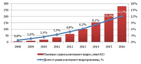 Самые благоприятные условия складываются в сегменте онлайн-видеорекламы. Доля потребителей видеоконтента постоянно растет. В 2010г. в России 49% интернет-пользователей регулярно посещали видеопорталы. В ближайшие четыре года, по прогнозам исследователей, популярность сайтов с видео будет ежегодно прирастать на 25%.