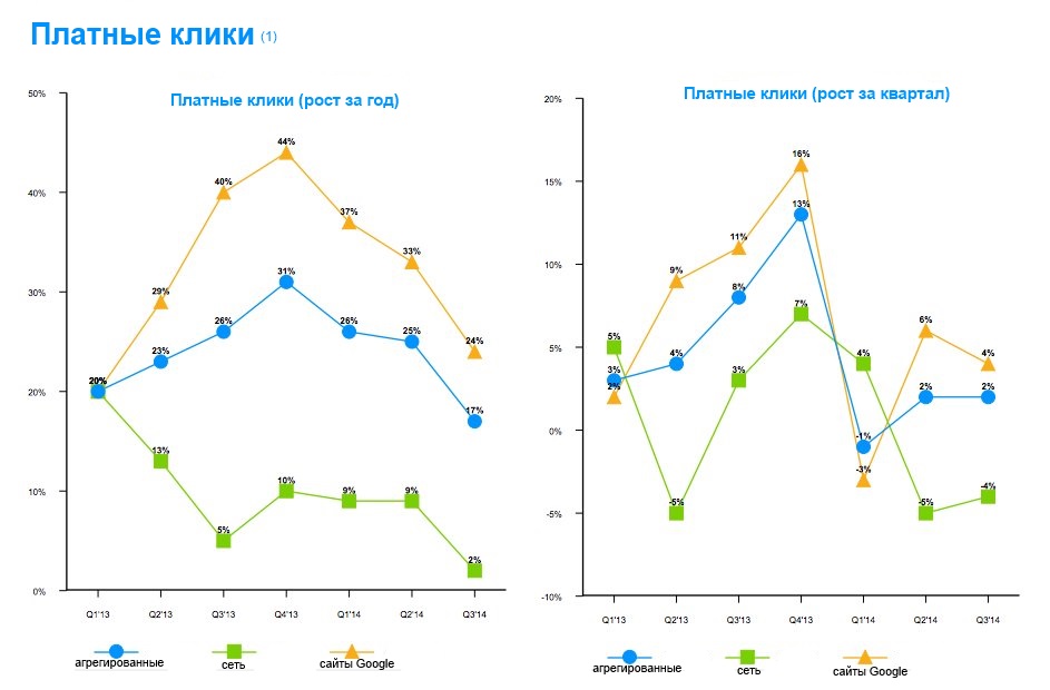 Лидер поиска также не оправдал надежд инвесторов относительно стоимости рекламного клика. Цена за клик увеличилась на 17% по сравнению с прошлогодними показателями вместо ожидаемых 22%.