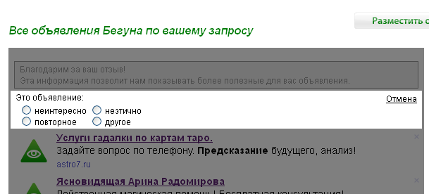 «Бегун» создал группу , критериями отбора которой был IQ 130 и выше, а также непререкаемый авторитет среди аудитории Интернета и выдающиеся аналитические и креативные способности. Теперь VIP-группа сможет отключать объявления «Бегуна» в рекламной сети. Все, что нужно сделать, – нажать на крестик рядом с объявлением и обосновать причину отказа.