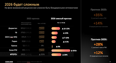 Okkam ожидает, что в 2026 году рост рынка в целом замедлится до 28% с учетом ecom и retail media, а рост в традиционных каналах составит 12%. Заметное сокращение темпов роста ожидается в сегменте ecom и retail media – до 45%, а также в OOH – до 7–10%.