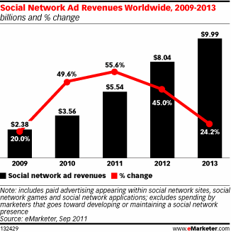 Как отмечает eMarketer, увеличение затрат на рекламу в соцсетях свидетельствует об увеличении их доли на рынке онлайн-рекламы. В этом году около 7% общемировых рекламных бюджетов уйдут в соцсети, в 2013 году этот показатель составит почти 10%.