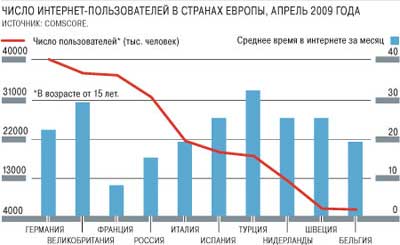 Россия занимает четвертое место в Европе по числу интернет-пользователей, уступая лишь Германии, Великобритании и Франции. По comscore .com/Press_Events/Press_Releases/2009/5/Turkey_has_Seventh_Largest_Online_Audience_in_Europe">данным Comscore, 31,3 млн. россиян в возрасте старше 15 лет посетили интернет в апреле.