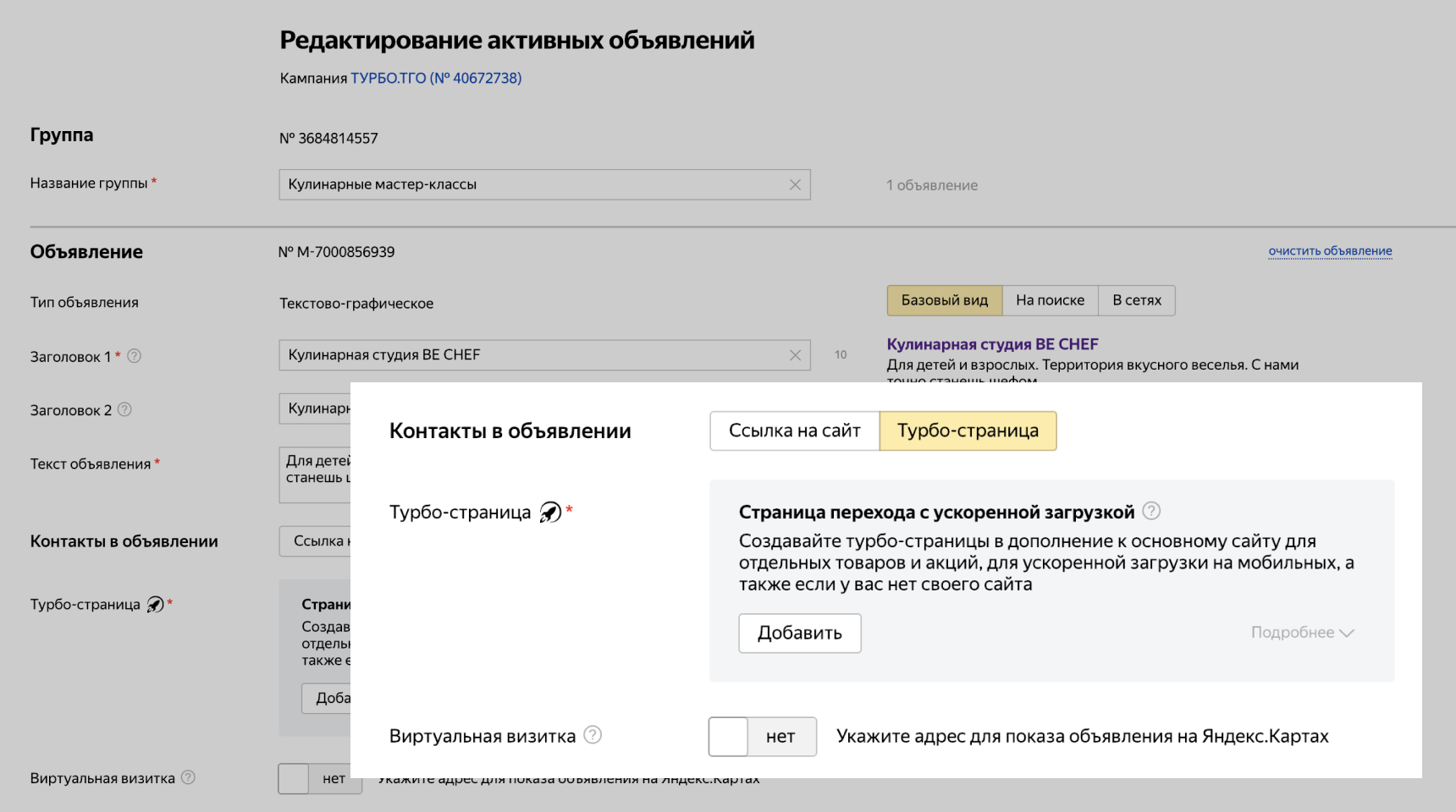 Создать Турбо-страницу можно на экране редактирования группы объявлений. Можно выбрать из готовых шаблонов либо создать собственный лендинг с нуля.