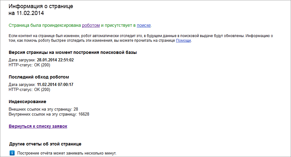 Как сообщает команда Яндекса, отчет формируется в течение нескольких минут и хранится 6 месяцев; всего можно создавать до 250 отчетов для каждого подтвержденного сайта. Если уже создано 250 отчетов и добавляются ещё, то старые версии будут удаляться по мере добавления новых.
