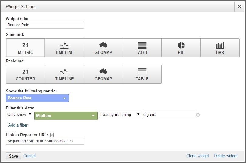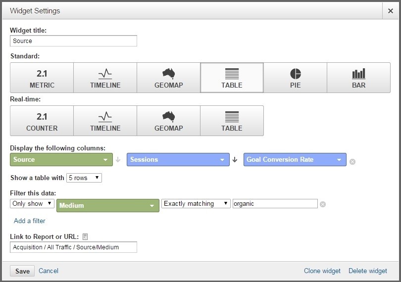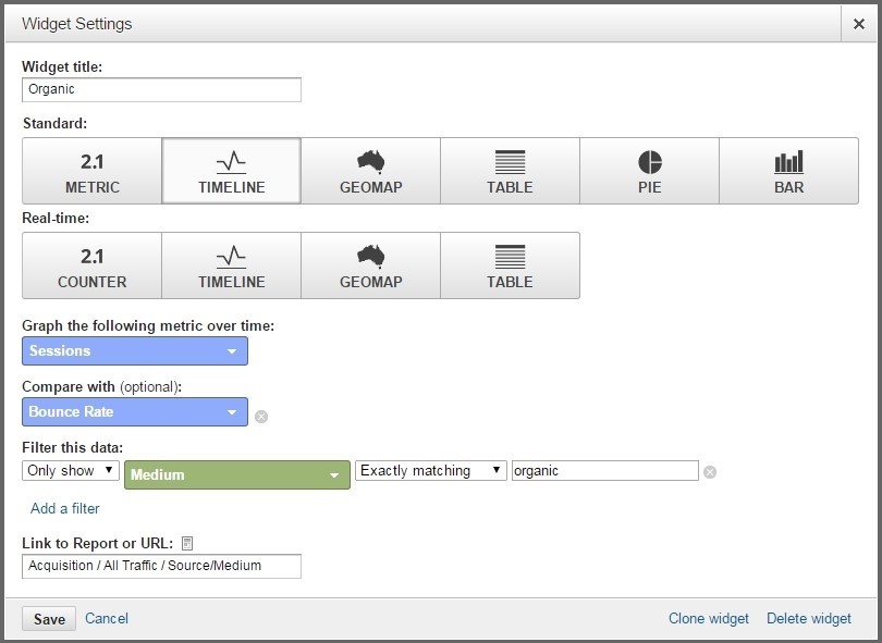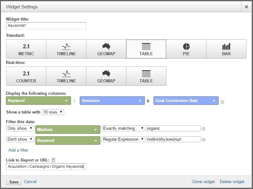 Важно не забыть установить фильтр только на поисковый трафик и добавить ссылку на подробный отчет в Google Analytics.