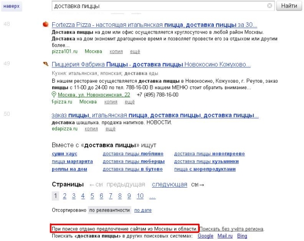 Есть более простой способ проверить, является ли запрос геозависимым — посмотреть, есть ли внизу страницы с результатами поиска сообщение «При поиске отдано предпочтение сайтам...», которое означает что запрос геозависимый: