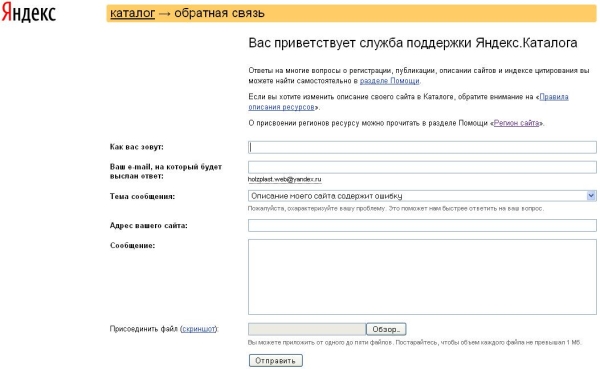 Если сайт зарегистрирован в Яндекс.Каталоге, то запрос на смену региона отправляется через . В ней нужно указать причину и регион, который нужно изменить.