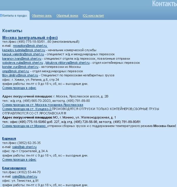 Если сайт продвигается одновременно по нескольким регионам, упоминать каждый из них во всех текстах не нужно. Это перегрузит текст. Достаточно разместить на сайте общую информацию об услугах компании. Данные о представительствах в нескольких регионах могут находиться на главной странице, странице «О компании» и странице с контактными данными. Пример ресурса, на котором информация о филиалах указана подобным образом — www.sherl.ru, страница с указанием адресов всех филиалов компании http://www.sherl.ru/kontakty/kontakty_v_gorodah/.