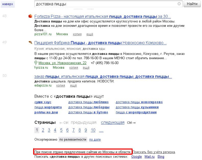 Есть более простой способ проверить, является ли запрос геозависимым — посмотреть, есть ли внизу страницы с результатами поиска сообщение «При поиске отдано предпочтение сайтам...», которое означает что запрос геозависимый: