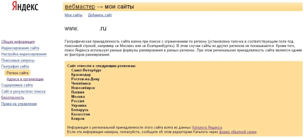 Регион пользователя определяется, прежде всего, по ip-адресу. Но на эти данные не всегда можно опираться. Ведь ip-адрес может присваиваться провайдером, работающим в нескольких регионах. Яндекс постоянно уточняет классификацию, получая данные от своих клиентов, партнёров и напрямую от самих пользователей (за счет изменения региона в настройках). Подробнее о технологиях Яндекса можно прочитать в соответствующем разделе . Если сайт не зарегистрирован в Яндекс.Каталоге, ему может быть присвоен только 1 регион. Если зарегистрирован — до 7 регионов. Встречаются случаи, когда ресурсу присваивается и более 7. Это могут быть до семи городов и до пяти более широких географических областей, например, стран. Возможно это для сайтов компаний, имеющих большое количество филиалов в разных городах или странах. Все их адреса должны быть обязательно указаны на сайте и желательно — в Яндекс\.Справочнике.