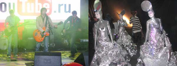 Уже на входе гостей ждала рассыпающаяся под ногами спроецированная клавиатура, каждый новый шаг заставлял буквы и цифры разлетаться в «разные стороны», обнажая яркую надпись YouTube.ru. Сразу после этого навстречу вышла группа в серебристых костюмах, следящая за происходящим вокруг с помощью небольших видеокамер. На протяжении всего вечера эти ребята-аниматоры поддерживали нормальный ход активации творческой энергии всех присутствующих.