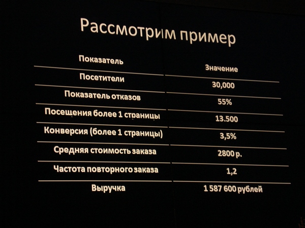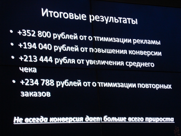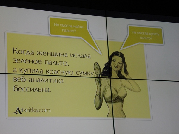 Первым на сцену вышел Андрей Юнисов из WebProfiters с презентацией «Самая большая ошибка всех веб-аналитиков». Довольно громкое название, не так ли? Что же это за ошибка? Оказывается, первоочередная цель веб-аналитиков – повышение конверсии – не такая уж и первоочередная, ведь в конечном итоге все упирается в выручку, полученную в результате конверсии. И именно на выручку, по словам Андрея, нужно обратить особое внимание. Вместо того чтобы лить воду, докладчик сразу же начал сыпать цифрами.
