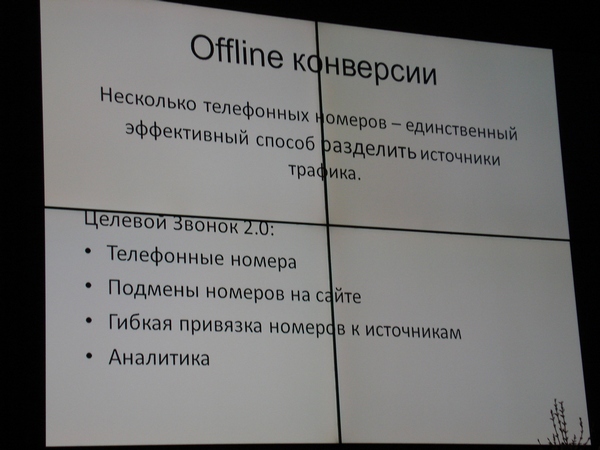 Для Offline конверсий Евгений представил систему «Целевой звонок 2.0», доступный пока что только бета-тестерам. Технология может оказаться полезна для Call-центров.