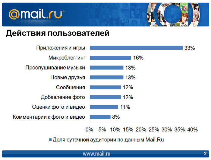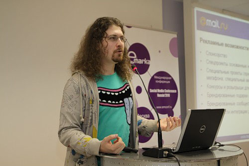 Открывал конференцию Максим Постников, заведующий в Mail.ru социальной сетью «Мой мир». В начале выступления он поведал, какие действия совершают пользователи социальной сети «Мой мир»:
