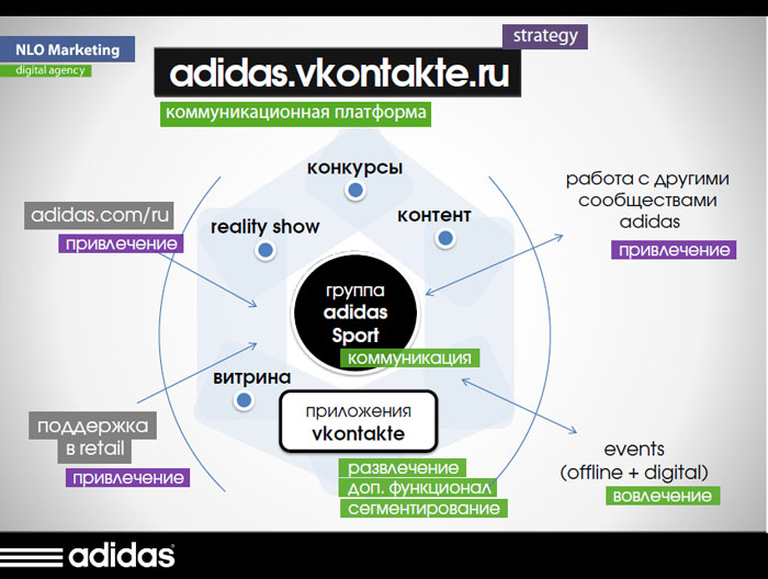 Далее Федор Вирин представил кейс «Интерактивная платформа Adidas в социальных медиа» и параллельно активно пропиарил группу бренда Adidas в социальной сети ВКонтакте.