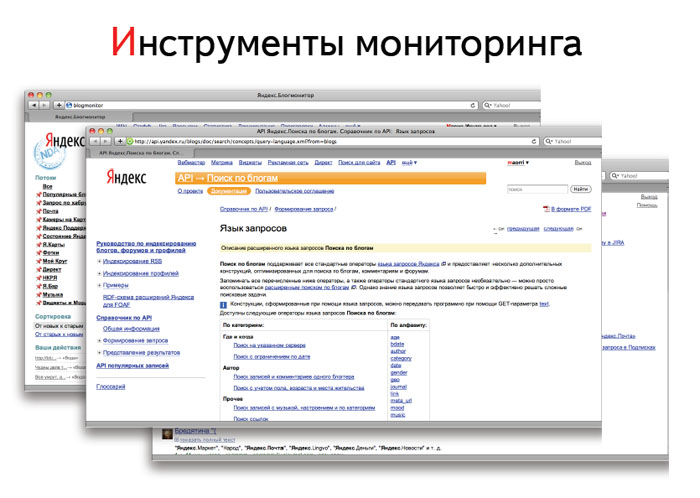 Несколько докладов было посвящено различным способам и автоматическим системам мониторинга социальных медиа. Представительница компании Яндекс Мария Игнатьева в своем докладе «Как устроен мониторинг блогов в Яндексе» интересно и подробно рассказала об устройстве мониторинга социальных медиа на предмет отзывов о бренде и продуктах в крупнейшем отечественном поисковике. Она начала свое выступление, обозначив главный приоритет для Яндекса - слышать своих пользователей. Однако даже представительница Яндекса честно призналась, что для них эта деятельность в новинку, и пока они сами еще исследуют и разрабатывают новые технологии мониторинга.