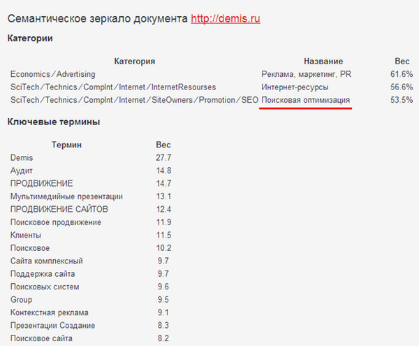 Здесь на помощь приходит очень интересная технология, которая называется «семантическое зеркало». Это разработка компании Ашманов и Партнеры, которая представляет собой очень хороший рубрикатор. В каждой рубрике прописано, какие ключевые слова и фразы можно находить на сайтах, которые к ней относятся.