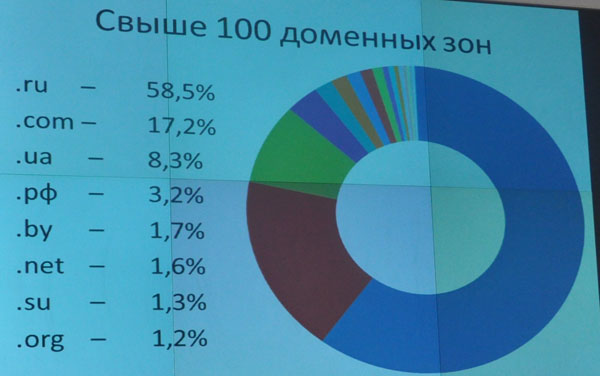 Докладчик приводит актуальные данные, которые его компания получила в ходе небольшого исследования. За 6 месяцев (апрель-сентябрь) в Яндексе и Google через объявления Яндекс.Директ и Google AdWords рекламировались 477493 разных сайта. Т.е. это практически все рекламодатели Рунета, которые есть в Яндекс и Google. И о каждом из них собрана информация. Когда перед вами вот такой объем данных, естественно хочется его изучить, но просмотреть их вручную просто невозможно. Поэтому нужно сделать некоторые замеры. Самый очевидный – это распределение по домену. В выборке присутствует реклама более чем из ста зон. Результаты не очень парадоксальны: