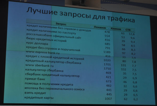 Можно выполнить нишевой анализ: взять все сайты одной ниши, объединить их в группу и работать с этой группой как с одним отдельно взятым сайтом. Докладчик приводит пример нишевого анализа области «Банки и кредиты»: