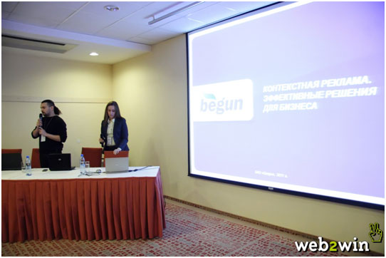 Далее выступила Надежда Давыдова, в докладе которой раскрывались возможности контекстной рекламы в Begun’е для бизнеса. Тему контекстной рекламы продолжил Довжиков, рассказав о том, как повысить эффективность рекламных объявлений за счет правильного составления текста объявления и подбора ключевых слов. После кофе-брейка Алексей Довжиков выступил с докладом по медийной рекламе, в котором подробно описал эволюцию «медийки» и современные форматы и приемы, применяемые в ней.