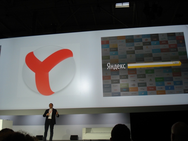 Далее выступил Хокон Виум Ли, главный технический инженер в Opera Software. Он в подробностях рассказал про технологию Opera Turbo, которая будет интегрирована в браузер Яндекс в последующих версиях. Константин Горский, разработчик GUI, поведал об особенностях интерфейса. Как он заявил, в браузере Яндекс самый минималистичный интерфейс среди конкурентов. После этого Тигран сообщил об открытии Yandex Store для мобильных приложений на базе Android. К его запуску рассчитывается поставить около сорока тысяч приложений.
